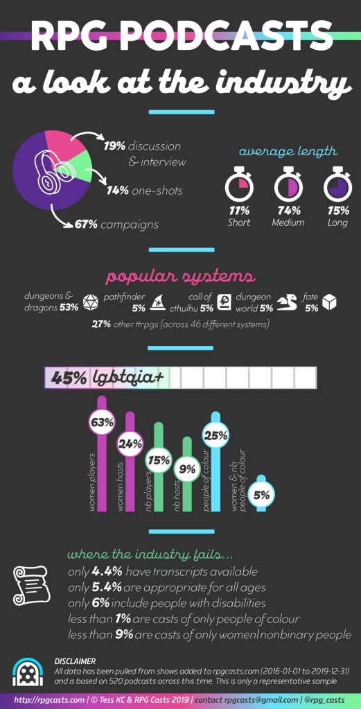 Tess Cocchio of RPG Casts, an online database of actual play tabletop roleplaying game podcasts, has amassed data on the demographics for podcasts listed.