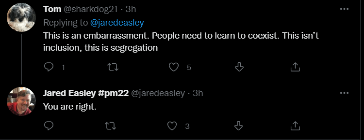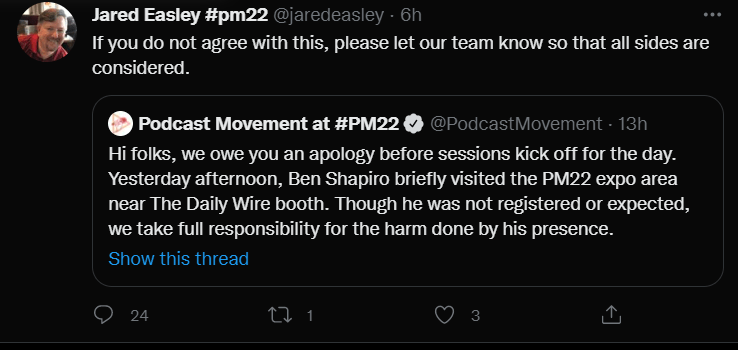 First, Jared Easley quote retweeted Podcast Movement’s apology thread with the text, “If you do not agree with this [apology], please let our team know so that all sides are considered.”