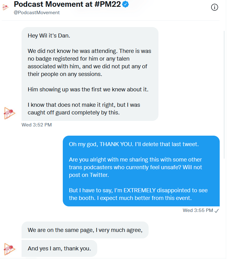 Wil: Oh my god, THANK YOU. I’ll delete that last tweet. Are you alright with me sharing this with some other trans podcasters who currently feel unsafe? Will not post on Twitter. But I have to say, I’m EXTREMELY disappointed to see the booth. I expect much better from this event.
