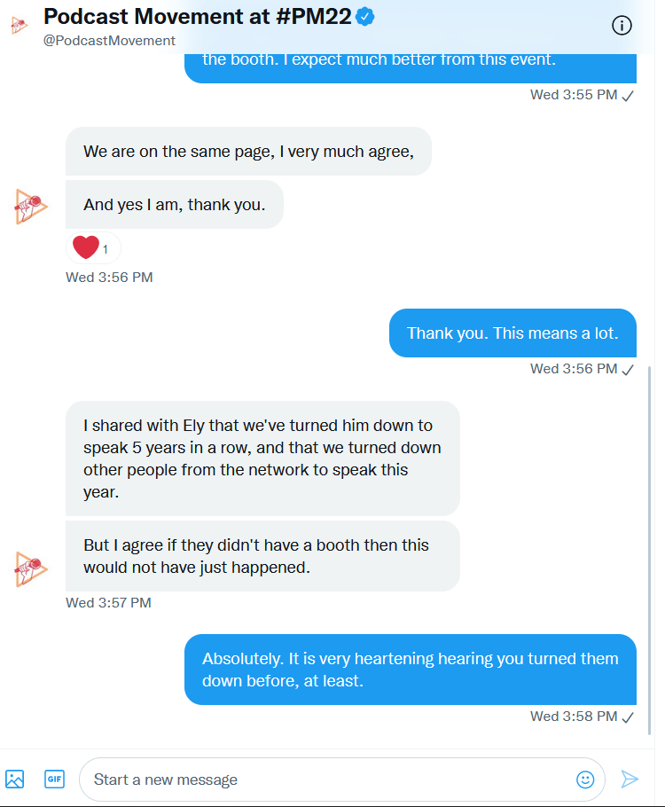 - I am deeply embarrassed by the quickness with which I showed Podcast Movement relief and trust in these DMs. I am often too trusting and too forgiving a person, which I’ll discuss later as well. If you’re frustrated by how easily I let them off the hook, know that I am, too. I hope this piece will make up for that as much as it can.